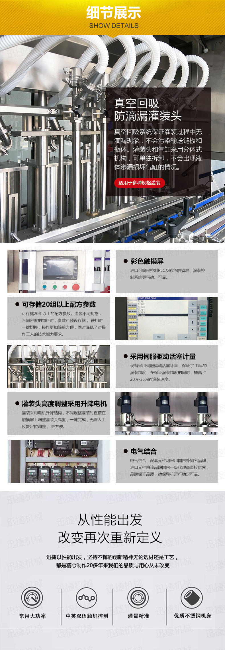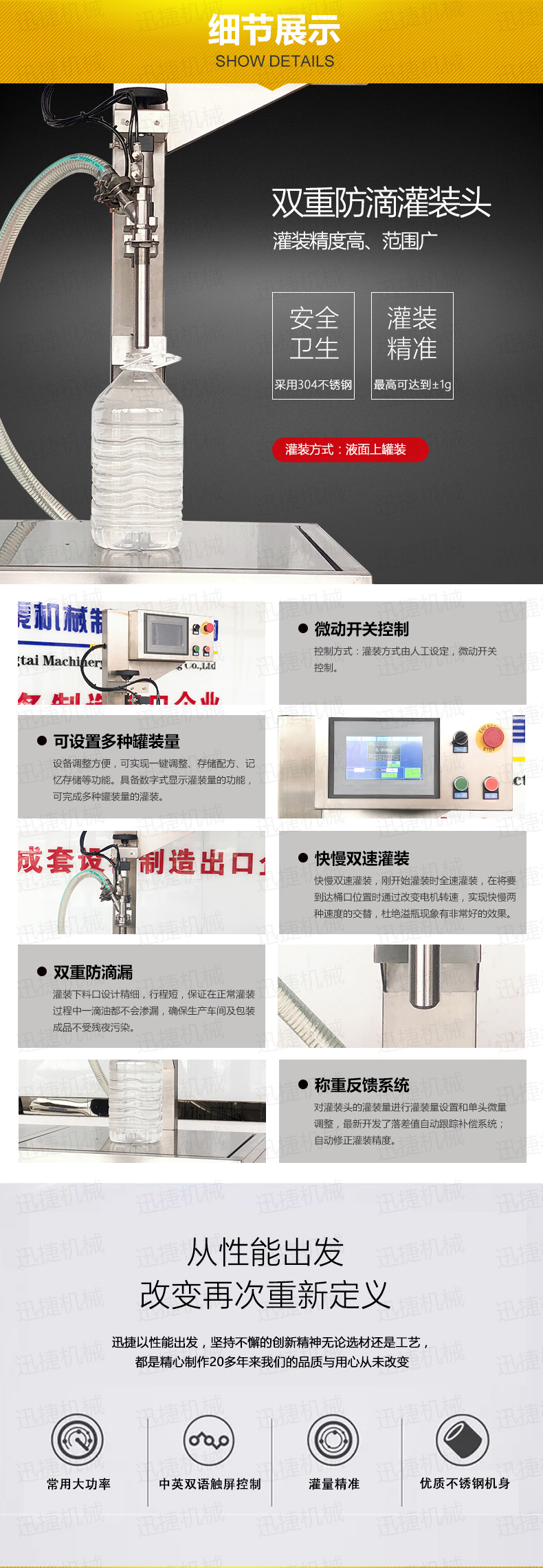 數(shù)字顯示灌裝容量,PLC微電腦程序控制,雙速灌裝控制技術(shù)電腦式定量、直線式灌裝防滴漏灌裝閥,不銹鋼制造