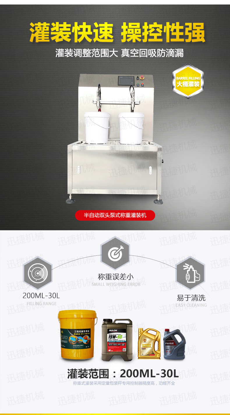 裝范圍廣、速度快、精度高—–1-20L大容量灌裝范圍,單頭單泵單變頻控制,灌裝速度快,壓力恒定,流量穩(wěn)定,單頭可直接修改誤差,保證了千分之一的精度