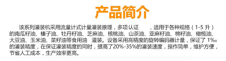 全自動油脂包裝成套設備油類全自動灌裝機產品簡介: 該系列灌裝機采用流量計式計量灌裝原理,多項認證,適用于各種規格(1-5升)的南瓜籽油、榛子油、牡丹籽油、芝麻油