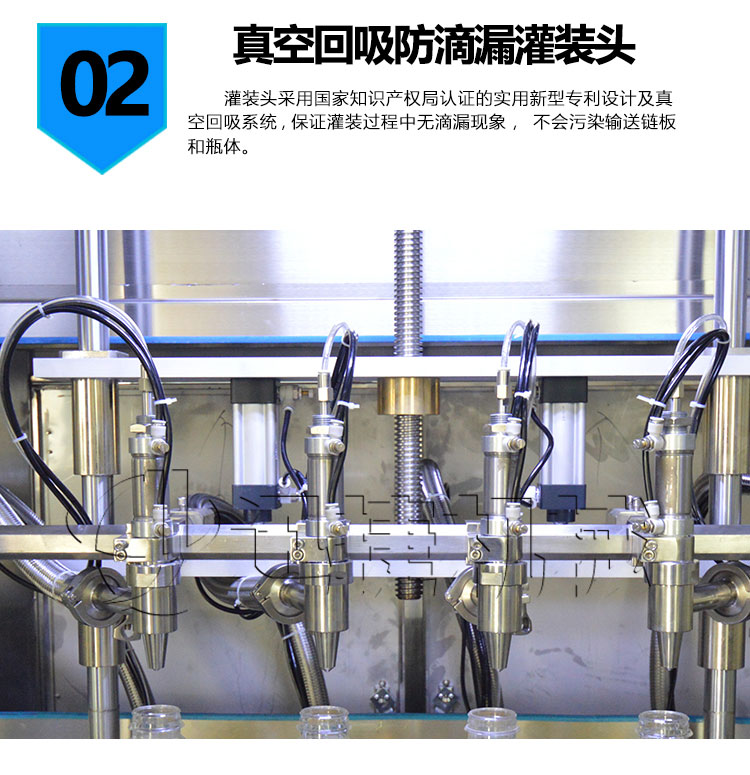 2、灌裝頭采用實用新型技術:真空回吸防滴漏灌裝頭;