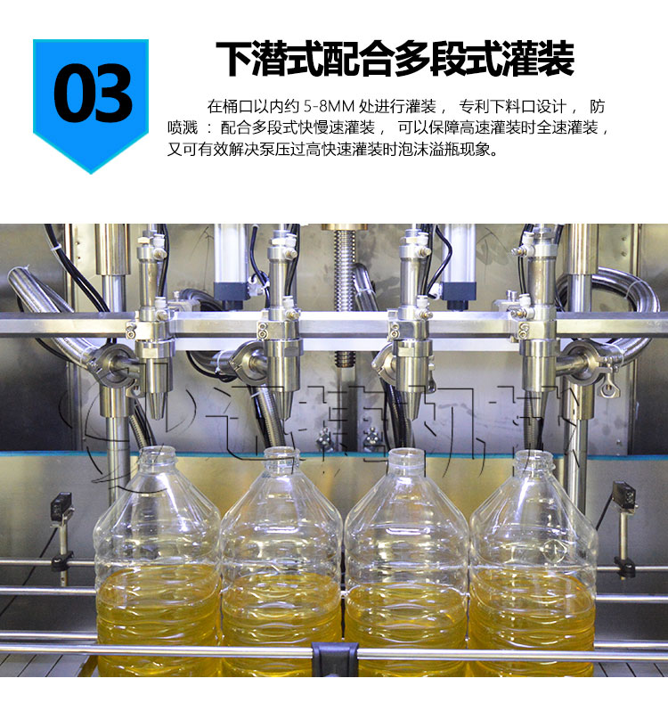 (2)摒棄了傳統夾瓶口灌裝方式,采用下潛式灌裝,在桶口以內約 5-8mm 處進行灌裝,下料口設計,避免了灌裝速度快產生細小油珠噴濺污染瓶口的現象產生。配合多段式快慢速灌裝,可以保障高速灌裝時全速灌裝,又可 有效解決泵壓過高快速灌裝時泡沫溢瓶現象,變頻控制更精確,自我保護更安全、穩定,延長設備使用壽命。